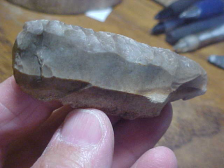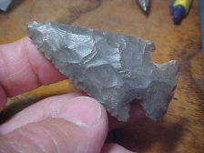 Out of the Union County, southwest Illinois, area--4&1/4" by 1&15/16", only 1" thick. The piece was a field find, it does show a couple plow scratches--and a really, really worked bit. Woodland use dulled that bit considerably--but it also shows you it's a "no brainer" authentic artifact. One face shows a glue spot, formerly a provenance tag that someone removed before I first saw the piece--all I can provide is the county of record. The piece is authentic as anything, though. Shipping is $10.00, with checks or M.O.s welcomed--sorry, I don't use paypal--Roy A.