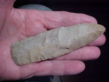 Out of a Hopkins County, Kentucky based collection--wasn't labeled if it was found there in Hopkins County, or across the Pond River in Muhlenburg County. The piece has excellent Early Archaic chipping--pure Pinetree, but what keeps the price reasonable is that the material is either a "tan chert" or a cortex off a Hornstone slab--I wish the flint were better, but the craftsmanship the Pinetree knapper put into the point, that's impressive: needle tip, basal grinding ( heavy), blade edge serration, and a "hooked barb" that I think was original to the blade--measures slightly over 1&7/8" by 1&1/2", 5/16" max thickness in the center. Every detail is lifetime guaranteed authentic. Shipping is $8.00, and payment welcomed by check or M.O.--sorry, I do not use paypal--Roy A.