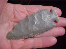 $0.00 additional cost for shipping on this Jersey County, Illinois, Dovetail, 2&5/16" by 1&5/16"--STEEP bevel sharpening. There is old use-wear on the very tip--run a fingertip across the tip and you'll definitely feel the wear (and the polish from whatever buffing action the early Archaic user was up to)., The flint has a decent polish (gloss), but identifying the four-toned material, I'm not 100% certain what to call it--the website "Illinois Lithic Materials should give some possibilities if you research it. Lifetime guaranteed authentic, period. I welcome checks and money orders, but do not use paypal--Roy A.