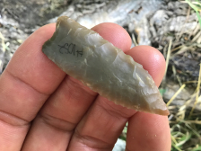 Outstanding flaking, glossy cobble chert with a fine tip and base recovered in Bastrop county. Lateral edges show use wear with pressure flaking. This is about as good as it gets for a Godley, and if it gets this good, it has to be from Bastrop County. I have the shipping. It has a Bill German COA.