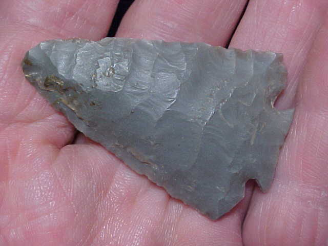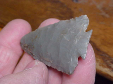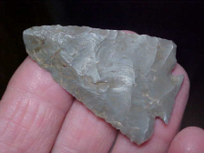 Out of a farm estate in Clark County, Illinois, made from Indiana Harrison County-type Hornstone, not quite to 2&1/8" by 1&3/8"--thickness is very slightly over 1/4" as the basal hafting area, thins as you go up the blade. The base if the Decatur is the "Fractured Base" type with the edge showing a very thin flake removed from each corner--the flakes meet in the center with the 'fingernail catch point. The base was then heavily ground. Both wings are intact, and show another Decatur knapping trick: they're cut-away instead of down-pointed--a "Clipped wing". There was a slightly more pointed tip originally, but there is a small (and Early Archaic made) salvage to the tip. The close up photo should show how the tip was angled. It's difficult to describe, but this is NOT a break, the 7500BP hunter/ knapper was working with the bevel on each blade side, and also working with a very thin blade to begin with. So he didn't need to narrow the entire blade, this was his 'trick'--it left a point to the end, just not a very sharp point. Every detail of the piece is lifetime guaranteed authentic, period. Shipping is $8.00, and I welcome checks, cash, or M.O.s. Please note my store does not use paypal--Roy A.
