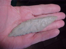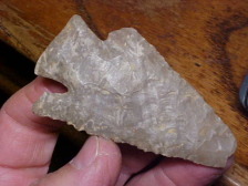 A Union County, Kentucky, Pinetree that was part of Dr. Skaggs collection--either a very high grade of Hornstone or a Sonora Flint--the bandings of color in the matrix could well be Sonora--but not a lot of the purple hematite color Sonora normally shows. Length is 2&1/18" by 1&1/8", the length reduced by multiple sharpenings and a very old Early Archaic-made impact fracture to the tip. Some of that channel flake coming down from the tip is a clear indicator of an impact fracture. The basal grinding is super heavy--out-and-out polish, not just grinding. The piece comes not only with a lifetime guarantee of authenticity, but some background information gathered at the Skaggs Auction as to the actual location of the find, who sold it to Dr. Skaggs. There were a number of Pinetrees from that site in the collection, and I've been curious if there was a creek where the finder collected what he sold to the Doctor--worth checking out as time permits. Shipping comes with the price, checks or M.O.s are welcomed. Sorry, my store doesn't use paypal--Roy A.