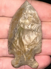 A super nice corner notch found in Knox County, Indiana on 6/2/02. Made from colorful mottled chert with great patina and mineralization. Well made with serrated edges.