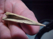 Off a family garden site in Macon County, Illinois--there, you'd expect a white Burlington Chert, but what the garden tiller brought up from that mostly Adena Culture site was dark Excello Flint, very dark blue with creamy inclusion bands. Other pieces ranged to a dull black--classic Excello Flint from the western part of Illinois, if you check on "Illinois Lithic Materials" site (excellent reference if you like studying flint that's found in each state). This long Adena is slightly over 3&7/8" by 1&3/8", and 3/8" or slightly over on the single thickest center ridge spot--as you move away from that slight stack the blade become very, very proportional in thickness, 5/16".The stem is edge-ground, looks like the Adena hunter removed an edge flake on the stem for better fit to the knife's handle--deliberate modification, it's not damage. One lower blade edge shows where the hunter repaired an edge chip from use--he 'cleaned up' a use-made ding. What I'm describing is all, every last chip guaranteed ancient. Off the side of the tip (see close up) is a small gardening-made chip--study the patina difference in that small spot, you'll easily see & understand the overall patina. Shipping is $8.00, checks or M.O.s are the only payments (other than cash) I use & welcome. Questions, please ask. If you have a counter offer, well, please, there is no reason to waste your time,--Roy A.