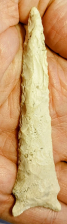 This Carved Fossil Bone Eskimo Cheek Plug was used by the Eskimo cultures for facial ornamentation. It was dug on St. Lawrence Island, Alaska. (If this artifact was larger and heavier it might be argued that it is a net weight or bolo weight but due to its lightness, it was more likely used for the stated purpose.)