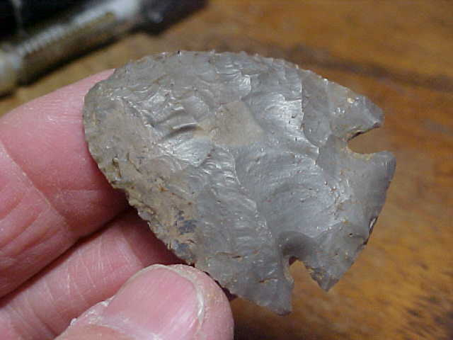 Only light basal edge grinding on this hornstone Kirk point--it the edge grinding had been more 'polished' I might have said "Lost Lake--a Stage-1 Lost Lake (no blade edge resharpening, no bevel to the blade edges. Check out the close up photos, the chipping work is as fine as any Early Archaic point you'll come across. Length is only 1&3/4", but the blade doesn't have a salvage look (or the thickness a longer blade would have had)--thinness never exceeds 1/4"--width is 1&5/16". The very tip does show a couple tiny 'repair flakes' made to keep the tip sharp. With this type of Harrison County, Indiana, hornstone there is color-banding--a nodule-type hornstone, not a layer (lense) flint--the center of the nodule shows off the edge, the higher quartz center of the sphere. Found in Posey County, Indiana, lifetime guaranteed authentic in every detail. Shipping is $8.00, with checks or M.O.s the way I welcome payment. Sorry, I do not use paypal--Roy A.