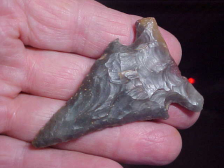 A "Tweener', elements of Lost Lake (steep bevels and extremely heavy basal edge grinding) and Hardin (very short base, barbs-to-basal corners, and barbs that are parallel to the basal corners, not 45o down-cast barbs. The pressure chipping (VERY high end workmanship) is clearly Early Archaic, 7500BO knapping. We can debate the 'classification' to slot the Spencer County, Indiana, point, but patination of the glossy hornstone is unmistakable--lifetime (mine) guaranteed authentic. Length is 1&13/16", and may have reached 1&7/8" if not for a tiny flat spot on the very tip. Width is 1&3/16", with 5/16" thickness. The thickness is very proportional, and indicates (as does the beveling) that the blade was considerably longer as first made. Nice point, real. Shipping is $7.00, checks or M.O.s are welcomed. Sorry, I do not use paypal or other payment services--Roy A.