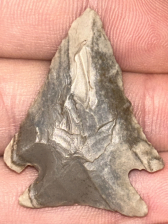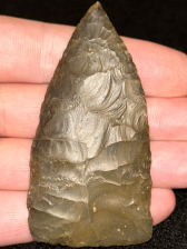 A fine scraper found by Jim Schuppert at the Dalk Mountain Site in Harrison County, Indiana. Made from glossy light grey Indiana Hornstone. In good condition with nice edgework.