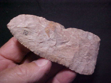 The long (3&5/16" by 1&1/8") Narrow Stem Waubesa came from the estate of Richard Brewer, Champaign, Illinois, area, but the flint (Hornstone, a banded vareity) has more of a "Kentucky look", it's not an Illinois Hornstone (Cobden Flint), so I expect Richard purchased the long point from some Kentucky dealer. Often, following a death, an estate sale, you're left 'filling in the blanks' if there isn't written provenance on a collection--I saw one small collection where the family had moved at least four times, gathering additional finds to add to their collection as they moved along--that collection was like a pile of string you're trying to unravel. This particular piece, I keep wanting to think of it as a Turkey Tail, but the 'fit' for a Waubesa is the closest. Note on the base of the stem there were two angled flakes fractured to make a sharp basal "V"--the knapper made the point fit the handle, not the handle fit the point. Flaking, patina, they're first rate work, they're guaranteed authentic in every detail. Shipping is $8.00 (new post office rates went into effect on 7-14-25). I welcome checks or M.O>s, but do not use paypal-type services--Roy A.