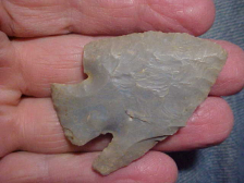 One fine, fine Waubesa,, and judging from all the sandy soil in the crevices of the flint itself, a riverbank find--slightly past 3&1/4" by nearly 1&9/16", but only 5/16" max thickness. The piece came from an Illinois estate--actually the only piece of flint the family had to sell. While I can provide the N.W. Illinois county, that doesn't provide any great provenance--the flint doesn't have the patina of Illinois Hornstone (Cobden, which patinates a brown color, shows multiple bandings in the flint)), but more resembles either an Indiana or Kentucky hornstone. Families move, their possessions travel with them, and that's why I think this Waubesa came from somewhere considerably east--or southeast--of its last home. Note there is slight tip wear, closeup photo should show it, and there is one very small spot of glue on one face--maybe that small glue-spot kept the piece from sliding in a shadowbox--easily removed, though. Every detail is lifetime guaranteed authentic. Shipping is $7.00, checks or M.O.s are how I take payment. Sorry, that means paypal-type payment services are not used--Roy A.