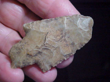 On one face the knapping scars are angle flaked, medial ridge to edge--and as it customary the reverse is pressure flaked in a more random pattern on one blade edge, some more of the diagonal (transverse) chipping on the opposite blade edge. The work Benton--Elk River knappers was some of the best workmanship of the entire Mid Archaic period. The point is either Hornstone or Sonora--in one light you see more of the greys of Hornstone, but there is a reddish hematite coloration of Sonora Flint in natural spectrum lights (I always recommend ANY collector but an Ott Lite). The big knife is close to 3&1/16" from tip to flat base--the blade isn't snap base, but was knapped to the very edge of the starting flint preform/ flake. Color bands and a partial bullseye show along the blade. The piece was Warrick County, Indiana, found decades back, long in storage--every possible detail is lifetime guaranteed authentic. Shipping is $7.00, with checks or M.O.s welcomed. Sorry, I do not use paypal--Roy A.