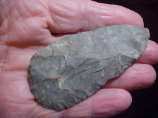 A creek find from Warrick County, S.W. Indiana--made from hornstone, slightly over 3&7/8" by 2&1/16", only 3/8" max thickness. I left the piece exactly as-found, mud and all--you see it exactly as the finder must have. There being no bevel sharpening, the knife is a first stage of the Cobbs Knife form. There is a tiny tip chip and that side repair--or shaft sharpener--cut in to the edge. It's sharp-edged in the indention, so if it was intended as a shaft scraper, it didn't get much use before being lost in a creek. Absolutely every detail is guaranteed authentic. Shipping is $8.00, checks or M.O>s are how I welcome payment. Sorry, I do not use paypal-type payments--Roy A.