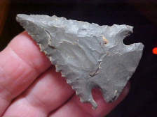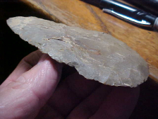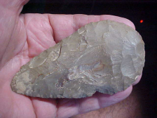 A creek find from Warrick County, S.W. Indiana--made from hornstone, slightly over 3&7/8" by 2&1/16", only 3/8" max thickness. I left the piece exactly as-found, mud and all--you see it exactly as the finder must have. There being no bevel sharpening, the knife is a first stage of the Cobbs Knife form. There is a tiny tip chip and that side repair--or shaft sharpener--cut in to the edge. It's sharp-edged in the indention, so if it was intended as a shaft scraper, it didn't get much use before being lost in a creek. Absolutely every detail is guaranteed authentic. Shipping is $8.00, checks or M.O>s are how I welcome payment. Sorry, I do not use paypal-type payments--Roy A.