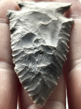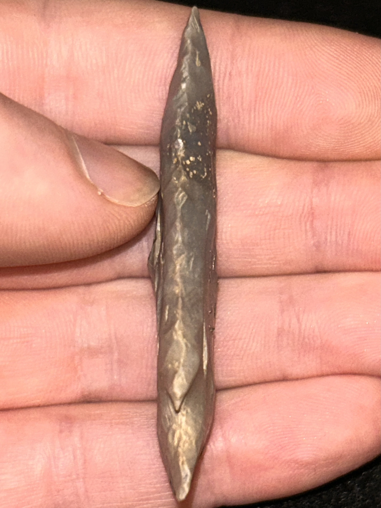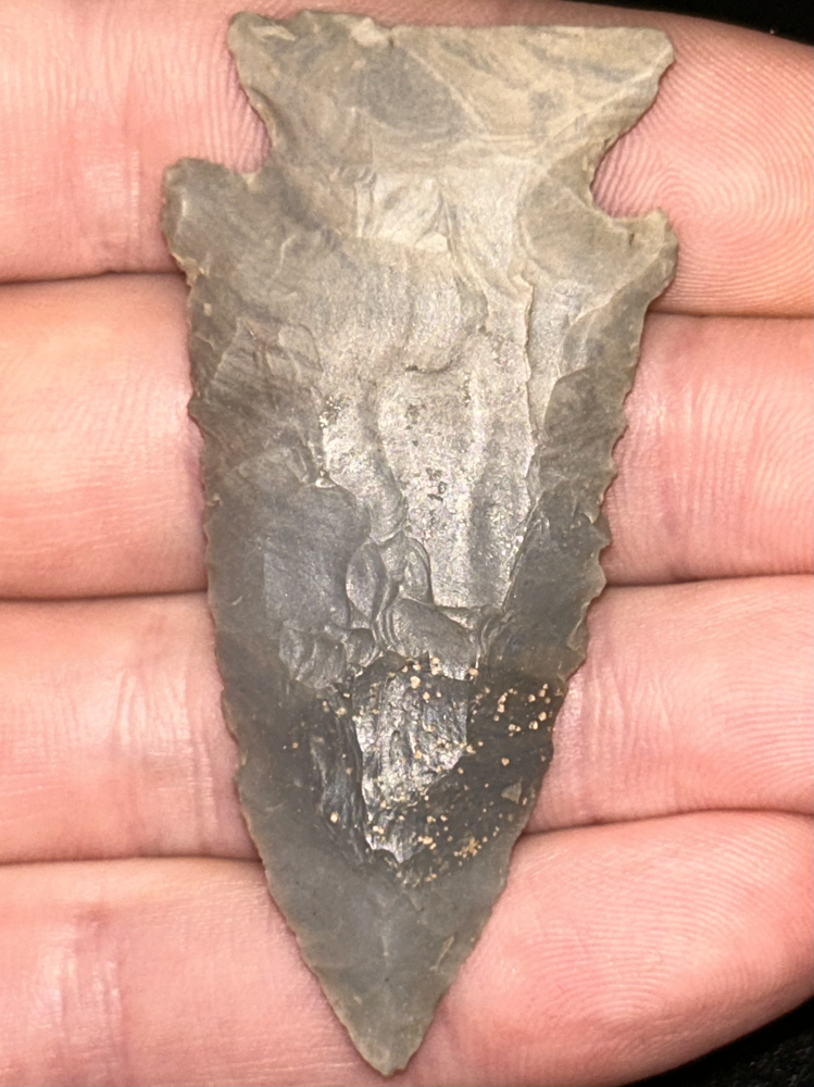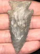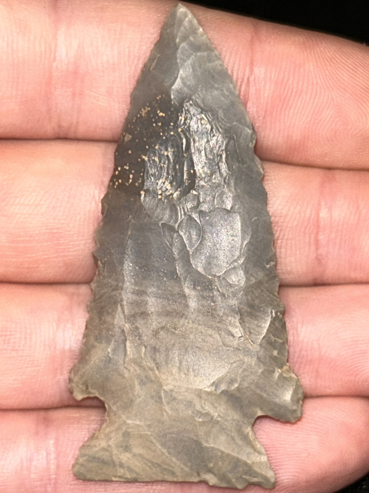 A fabulous Stilwell found by Daniel Flynn in White County, Indiana. Made from beautiful grey-blue Hornstone. Finely made with classic form and lightly serrated edges.