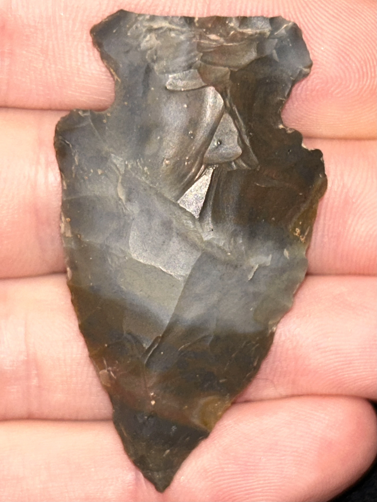 A nice Hopewell found in Woodford County, Kentucky. Made from beautiful multicolored Sonora chert. Retains some original flake surface on one side.