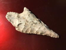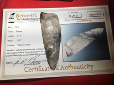 This High Plains Knife is made of river polished Winterset Chert recovered in Kansas. The base is thinned with pressure flaked lateral edges. It has a Bennett coa and I have the shipping.