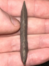 An excellent MacCorkle found in Hardin County, Tennessee. Made from high grade glossy grey Hornstone. Very well made and finely flaked with serrated edges.