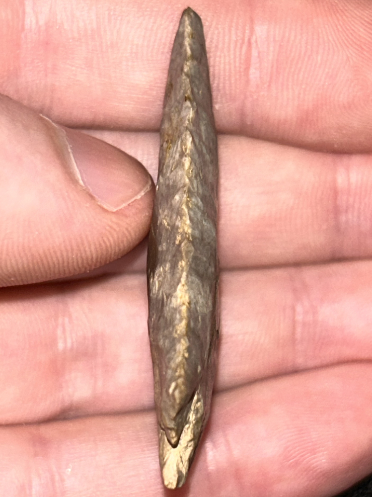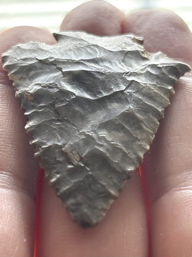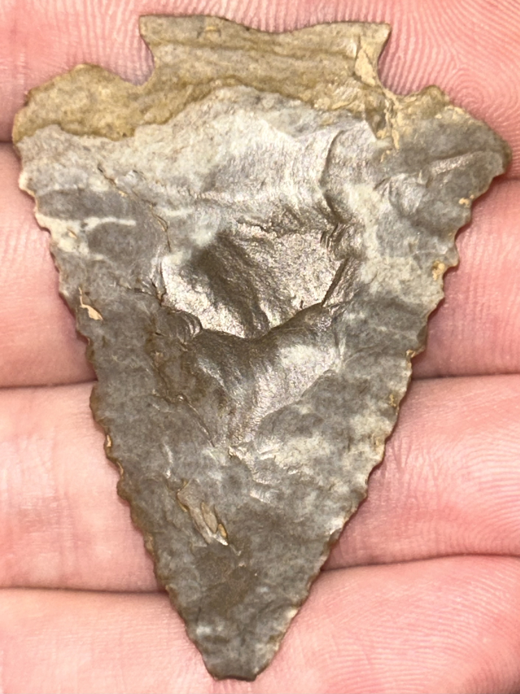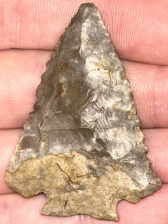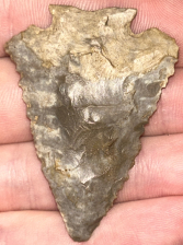 An outstanding Decatur found in Barren County, Kentucky. Made from beautifully mottled and colorful Fort Payne chert. Classic form with excellent flaking and fractured base.