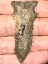 A fine Pinetree found in Marshall County, Alabama. Made from well patinated medium brown Fort Payne chert. Well made with serrated edges and ground base.