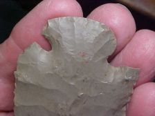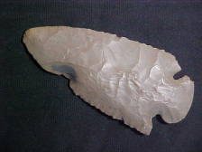 If it takes you more than one glance to say "That's real" I'll be very, very surprised. Length is a very long 3&7/8" by 1&13/16", and at the absolute thickest spot on the medial ridge (a tiny stack in the flint) my caliper closes on 7/16". While the Warrick County, Indiana, Dove was bevel sharpened there weren't a great number of sharpenings of the blade, the bevel is 'moderate', not a sharp angle that would have shown repeated blade edge sharpening. Note the interesting rounding of the Dove base--it was original to the piece, the rounding wasn't a result of basal salvage--first time I've seen a Dove made this way in my half century of collecting--learn something new all the time (as one should). Barb end chips, slight use-made damage are 100% patinated--the rounded tip also is from the 7500BP Early Archaic usage. Now why the blade edge 'ding' still shows a dark center is something no one could fully answer; at its outer edge it's patinated that grayish-brown, same as the color of the big chip on the inner side--only the center of the chip shows dark flint. "Just the way the flint patinated (with time) is the only answer I can provide--ain't new, lol. I welcome checks or money orders, but on this store you cannot use paypal--sorry--Roy A.