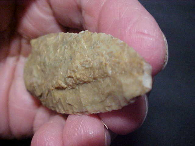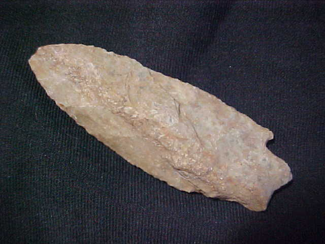 A S.W. corner of Indiana creek find, one I put in a frame last year with a "What is it?" note. Length is 3&1/4", not quite to 1&1/8" width, and a thick body due to the rough Indiana Holland Flint that reaches 7/16" max thickness due to a strong 'stack' in the flint. The base, though, is interesting, auriculate and strongly ground--the pressure chipped blade edges also testify to the piece being Early Archaic Culture. The closest I've come is that the piece is some variation on a Cresap ( a weird type of early Adena), or a Heavy Duty Point. I acquired the piece with a small modern chip on the very tip--price reflects the damage, but it also wouldn't be the first point found n a creek where a deer stepped on the piece. Creeks are like interstate highways for deer, the foot traffic can churn up the gravel beds as deer start moving in the fall. Neat piece, guaranteed authentic. $8.00 shipping as the USPS keep finding reasons to increase postage. I welcome checks, cash, or M.O.s, but do not use paypal--Roy A.
