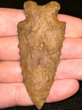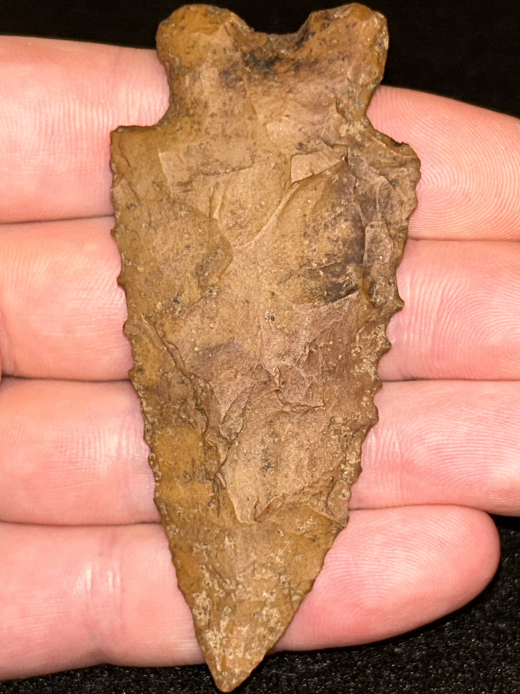 An outstanding MacCorkle found in Benton County, Tennessee. Made from heavily patinated orange-brown chert (likely Fort Payne) with great mineralization. Nice size with excellent flaking and workmanship.