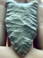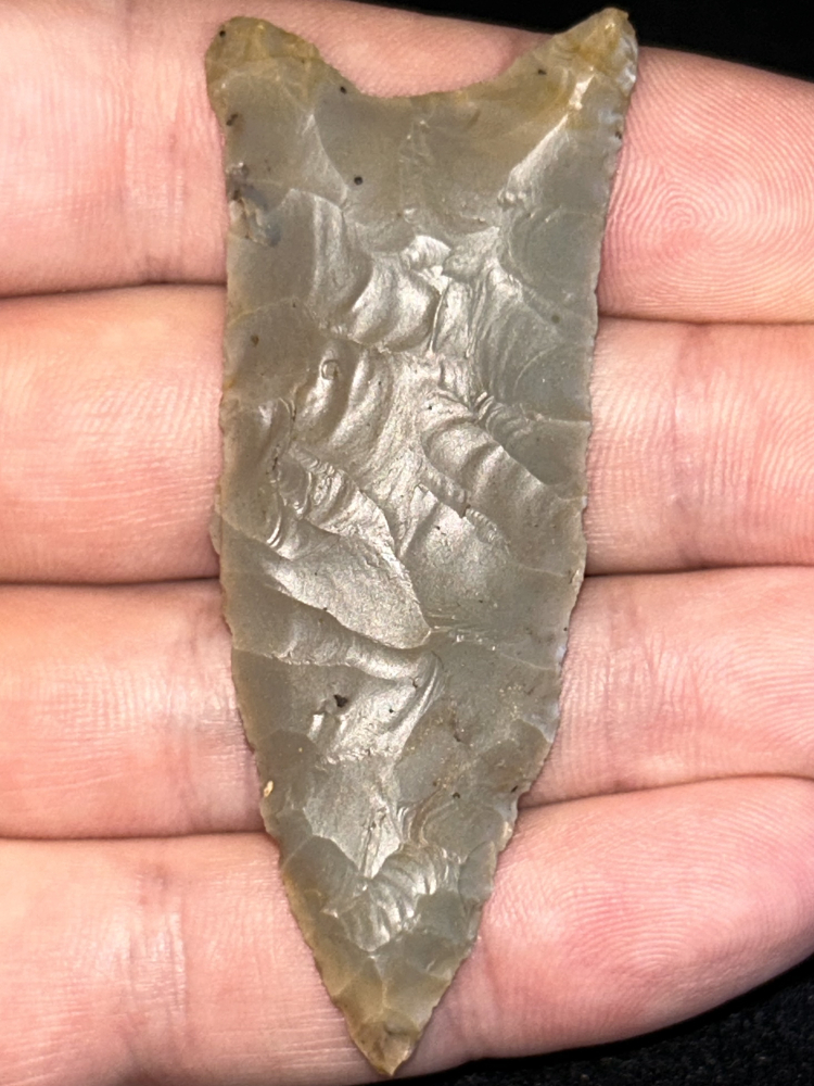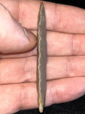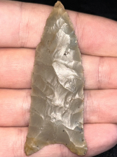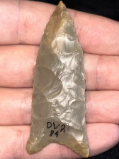 An outstanding paleo Quad found in Pendleton County, Kentucky. Made from glossy orange-grey Carter Cave chert (COA calls it Hornstone) with great mineralization. Very thin and in excellent condition with fine flaking and form. Ex: Rector and Bodner collections and comes with a Davis G-10 COA.
