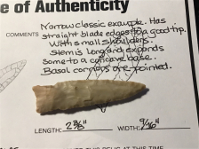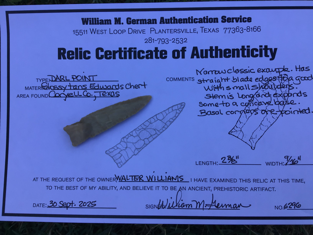 This Darl with bilateral flaking from Coryell County. Nice basal corners with concave base in classic Darl style. It has a Bill German coa and I have the shipping.