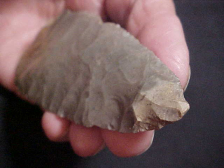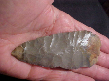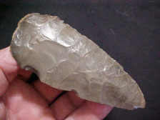 You insist on patina for anything that goes in your collection--me too--this Warrick County, Indiana, creek-found Cobbs Knife will fill that requirement. My caliper sits on 4&3/16" by 1&3/4"--slightly over 3/8" max thickness--REALLY proportional. If I'm to point out anything, it's the long flakes that form the blade edges--they travel to--and past--the medial ridge. That chipping technique is very similar to what Paleo knappers used--Outre Pas chipping. Cobbs Knives are generally considered as Early Archaic Culture, but this piece shows an even earlier knapping technique than was "Early Archaic standard". Was there some ancient damage to one blade edge; yes. Too, was the tip used as a drill (or burin)--again, yes. Tools that were used show wear. Period. The finder is no longer living, but I'd sure like to know if the creek source of this knife was right behind his country home. I'll pass along all the provenance I received with the piece to the next owner. Shipping is $8.00. checks or M.O.s are welcomed--sorry, I do not use paypal-type payments--Roy A.