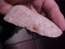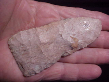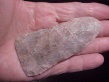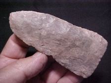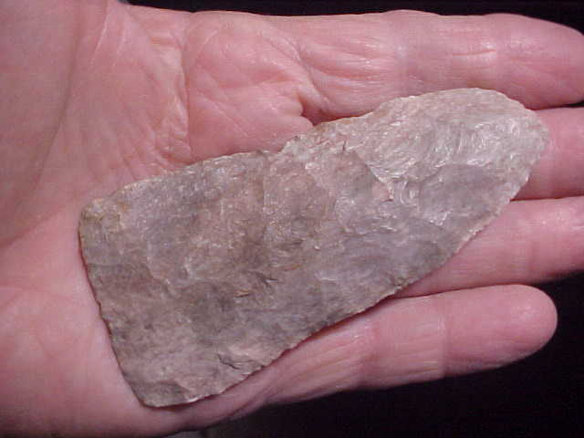Nice Cobbs Knife--or as we called a square base knife decades back--a Stanfield Knife. Early Archaic, very well made blade on this 4" by 1&13/16", 3/8" thick blade. The one blade side shows either a repair spot or a shaft scraper--you CAN feel use polish, so the indentation had a useful function. The flint is a heat treated fossil chert, one side more darkened from the heat treating than the other face- I still switch between identifying the material as Bowling Green Chert and Bailey Chert--sometimes you 'think you know', but even "the chert expert", Tony DeRegnaucourt once told me: " You have to know where the piece was found" (to identify similar types)--what is clear is the patina--authentic, and guaranteed authentic as long as I'm alive. If you can beat that guarantee, go for it. Shipping on the Lawrence County, Illinois, based knife is $8.00. I welcome checks or M.O.s but do not use paypal-type payment systems--Roy A.