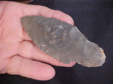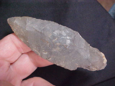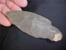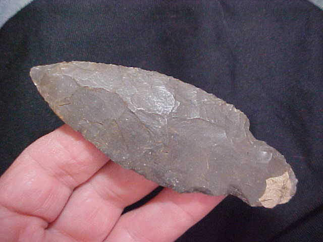 Indiana Knox County origin, made from Hoosier Harrison County Hornstone, right on 4&1/8" by 1&7/16"--proportional, slightly over 3/8" max thickness in the center. The base shows a small area of cortex. The only damage is a small area on one shoulder, two spots where the patination was disturbed--photo should highlight the pair of dinge (modern damage)--price reflects it, too--came to me this way, so all I can do is give a 100% "Here's what I know".