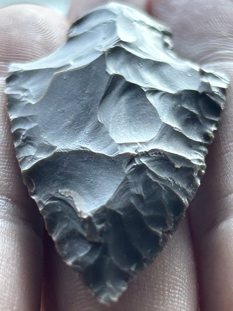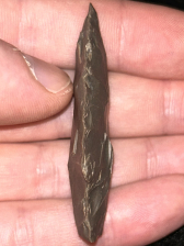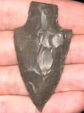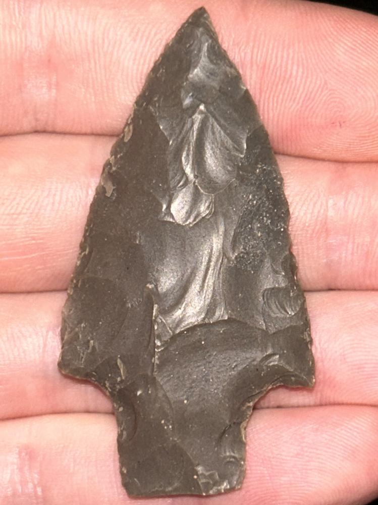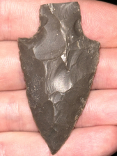 A fine Adena found in Harrison County, Indiana. Made from quality dark grey Hornstone. Nicely made with a sharp tip.