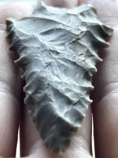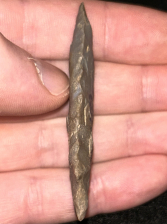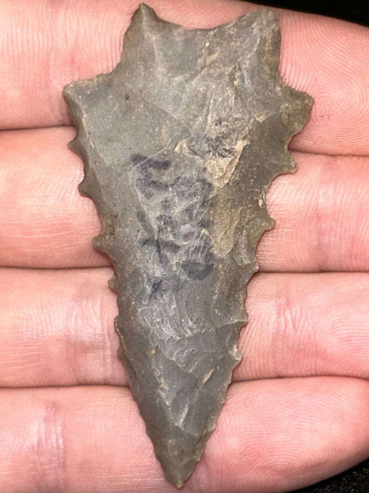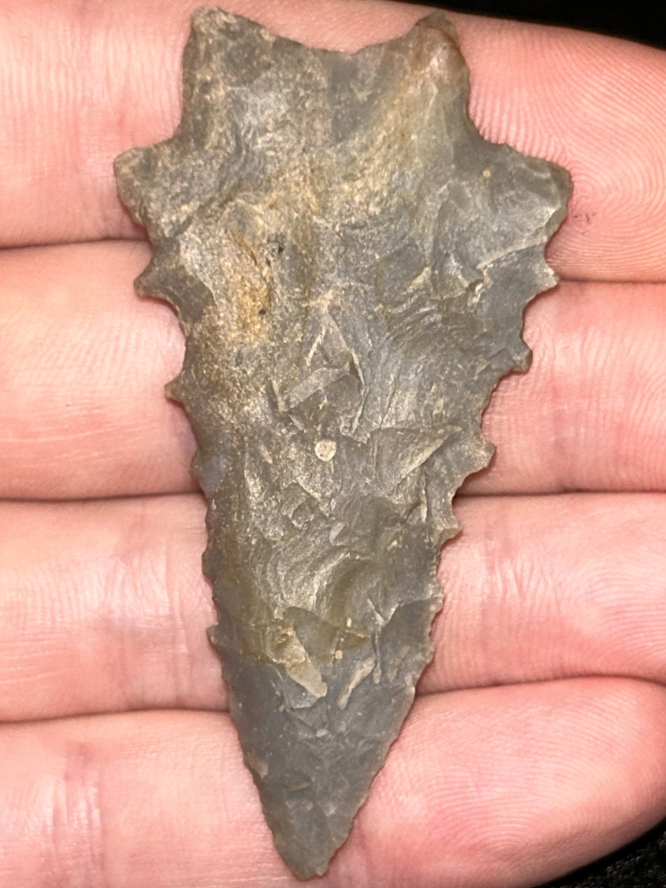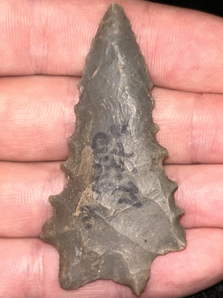 A fabulous Stemmed Kirk found on 8-15-77 along the Cumberland River in western Kentucky. Made from heavily patinated blue-grey Hopkinsville chert. Great form and serrated blade edges.