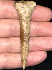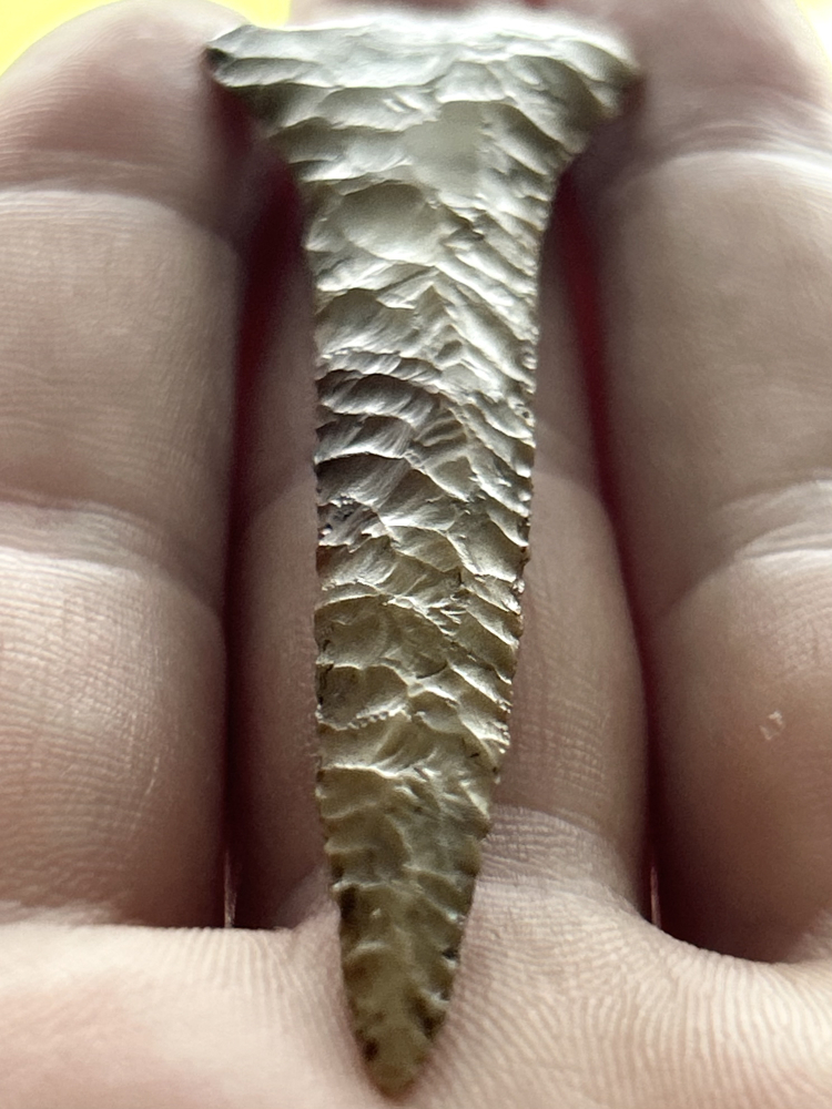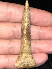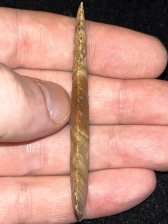 An outstanding drill found in Fleming County, Kentucky. Made from glossy high grade Carter Cave chert with a beautiful rich orange-brown bullseye in the center. In perfect condition with excellent workmanship and flaking.