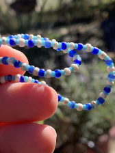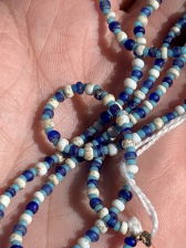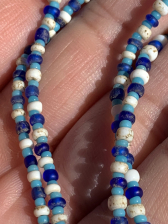 Includes pale blue, dark blue and white seed beads, a lot of them are covered in deposits and patina .