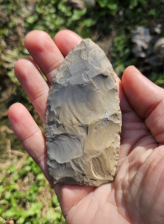 Very fine blade found in Dickerson Cave in Todd County, KY ex Dossett. Excellent broad percussion removals, some are nearly edge to edge. Great relic and locality! Measures 3 1/8 inches long by 1 3/4 inches wide.