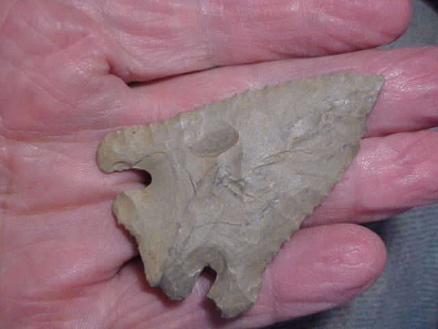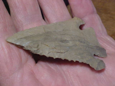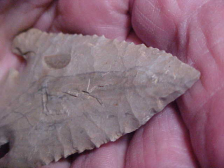 Warrick County, Indiana, a piece that's been in my collection almost fifteen years now--fine grade Pinetree that's made of a "grade" of Hornstone, some inclusions in the flint so I know it isn't our typical Harrison County, Indiana, Hornstone. Length is very slightly over 2&1/2" by 1&13/16" with thickness being only 1/4"--good numbers, they tell you the piece has excellent symmetry. The base is intact, but does show where the Pinetree Culture knapper made tiny adjustments to make the blade head fit the handle--whether this was used as a knife or possibly a projectile (I expect it was a knife). The basal edge is auriculate, conforming to the thinner edge of the flake the knapper began working. The tip is the one thing that keeps the price from being higher--an impact fracture to the edge of the tip (see the close up pics from each face). The fracture happened in Early Archaic usage, it dates the same 7500 BP age as the guaranteed authentic blade. I pay the shipping, it's included with the price. Payment: you can send a check or a money order, but please note I do not use paypal--Roy A.