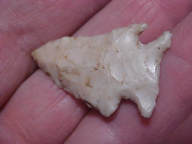 A Lawrence County, Illinois, Pinetree dart--or Palmer, as that Illinois county is right next to Indiana, Palmer points being something you'd see more in Indiana. The basal edge shows grinding, so for that reason I wouldn't call it a Kirk Cornernotch dart--someone else might use that designation as Kirk, depends on whether (in your experience) Kirk darts DID use basal grinding...they just failed to grind bases on their larger hafted knives. Arrowheads, like life, there are always exceptions to the rules. The dart is made of a glossy form of Burlington--Crescent Quarry Chert--patina is obvious, mineral deposits everywhere--length is slightly under 1&3/8" by 7/8", but OBLY 3/16" max thickness. One barb shows an ancient (use-made) end chip--nice 'adjustment notch' made in the base to better haft the piece. Guaranteed real, period. Shipping is $8.00 (USPS Holiday rates, unfortunately)--checks, cash, or M.O>s are welcomed, but paypal is not taken--Roy A,