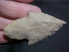 One look at that base and you know there was (to start with) a lot more blade--An Adena knapper would never make a base that large unless there was a corresponding large flint blade above it--sharpened down with use, the entire knife now measures 2&5/8" by 1&7/16"--with a 3/8" max thickness, the thickest part being nearer the tip. When the upper blade holds the thickest measurement it's a simple jump to knowing the blade was considerably larger. Made of a weathered grade of Indiana Hornstone, the piece shows almost a creek find-type patina. Because the piece came with some Perry County, Indiana, Adenas (my old hunting grounds), I know the form, the material, and can guarantee the authenticity. The one snapped-off barb is an ancient chip, and an impact fracture to the edge right above the missing barb indicates the piece was in use after that barb was broken--price reflects the ancient damage. For the work it took, the Woodland Culture hunter made a very sharp tip to a blade that was both shortened and narrowed--almost a 'burin' the tip is so sharp. Shipping is $8.00, checks, cash, or M.O.s are the payment methods I use. Sorry, I have nothing to do with paypal--Roy A.