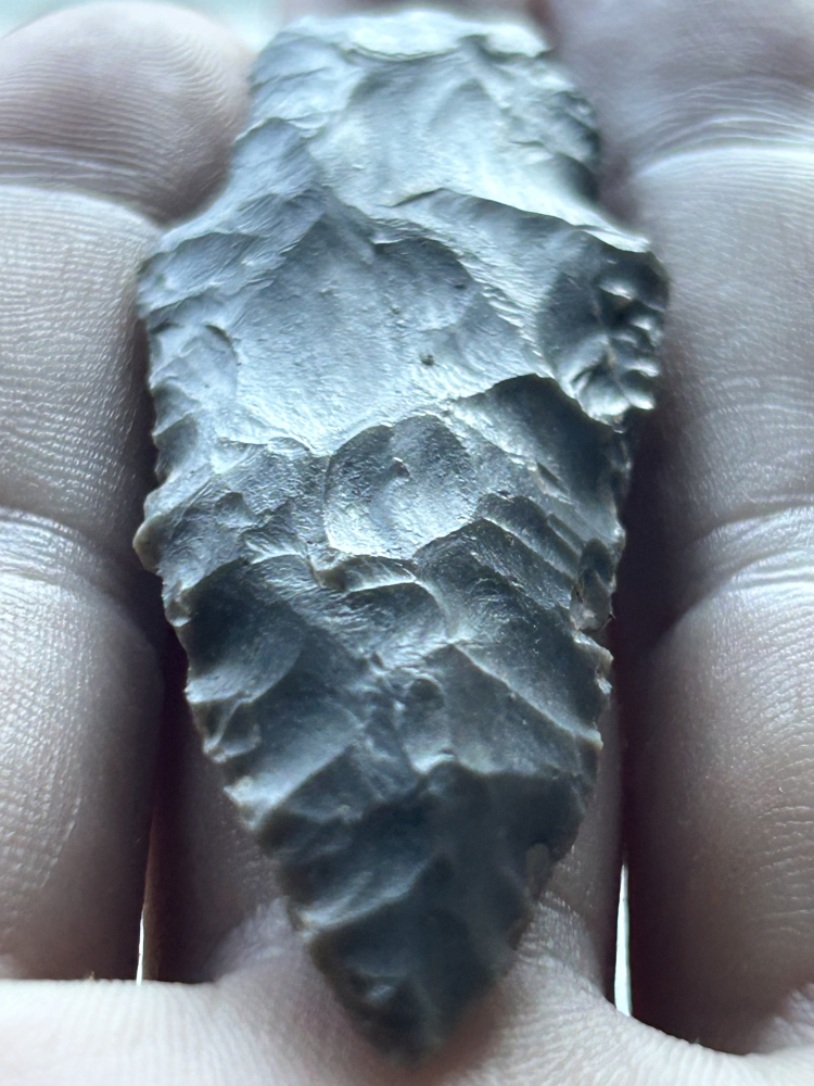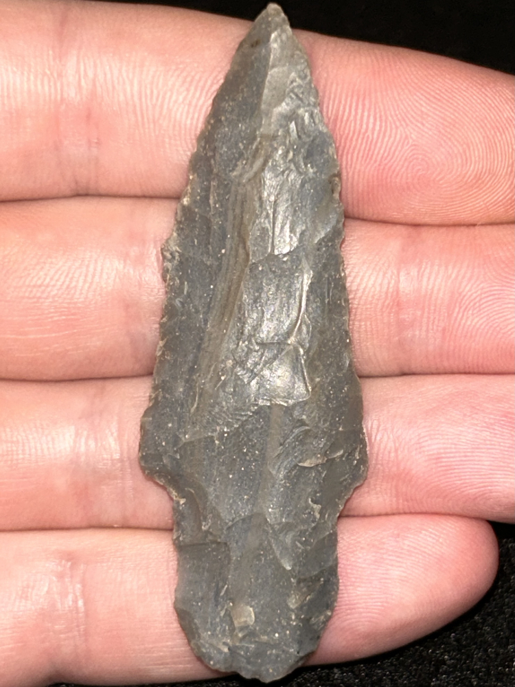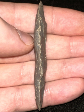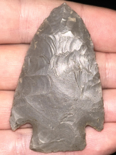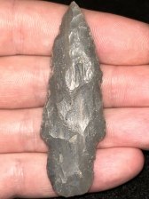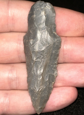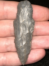 A nice Adena found in Harrison County, Indiana. Made from striped grey Hornstone. Nicely made with good workmanship.