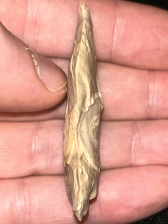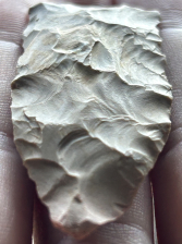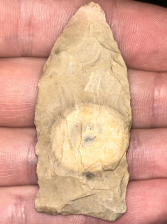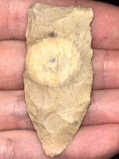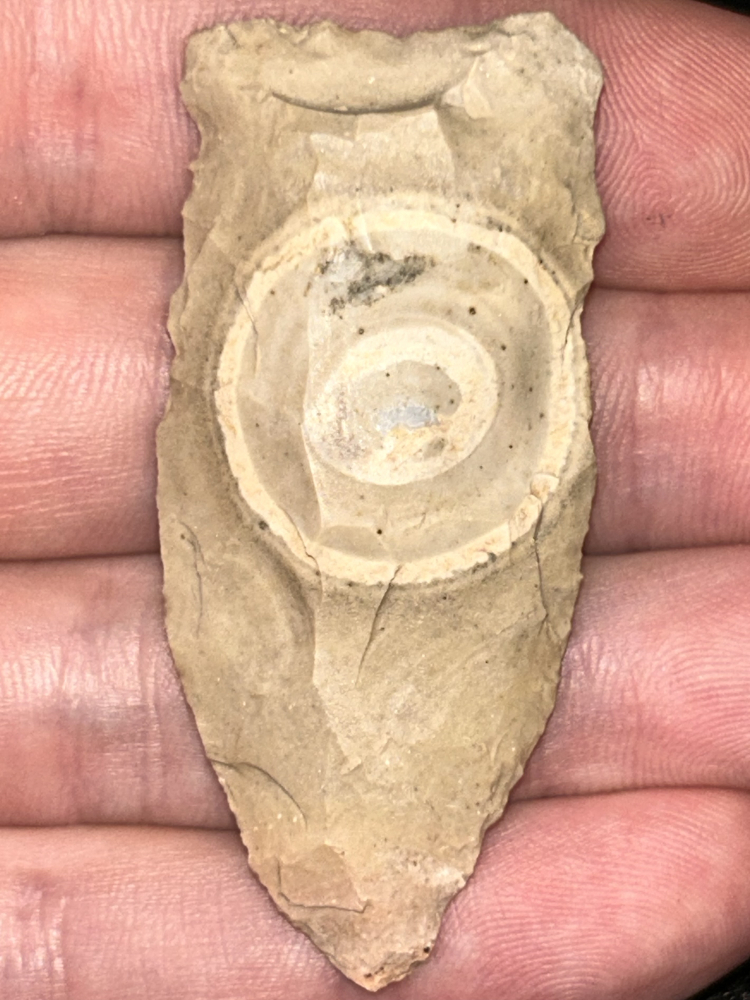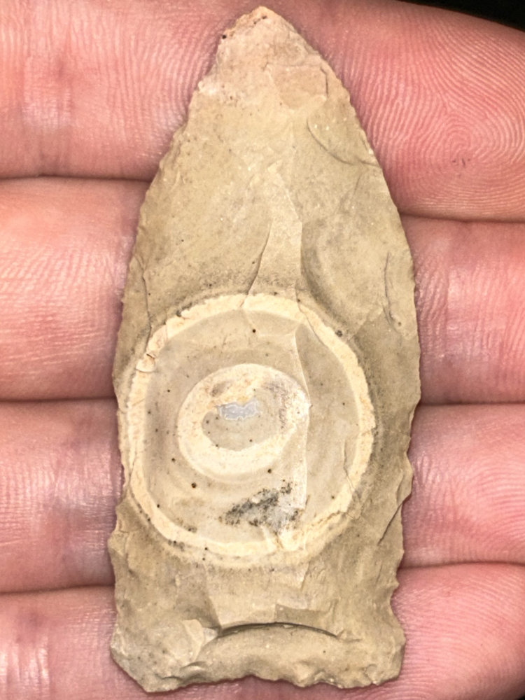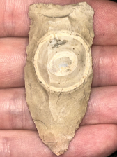A nice Copena found in Harrison County, Indiana. Made from pale tan-grey Hornstone with a unique bullseye. Very interesting piece.