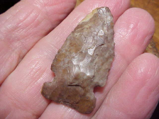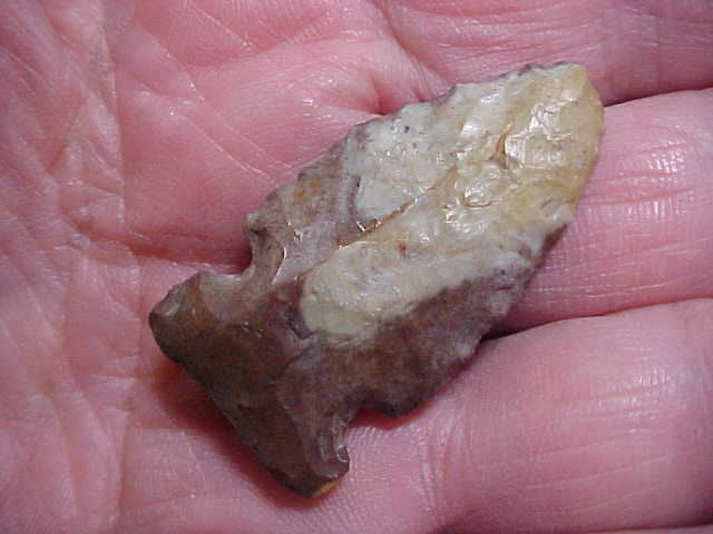 Flint: AS best I can identify the flint it's a heat-treated Indiana Spencer County Holland Flint--you SELDOM see Holland Flint heat treated, so this may have been an accidental heat-treating--a flint chunk used to ring (contain) a campfire, the fire changing the color of the flint.
