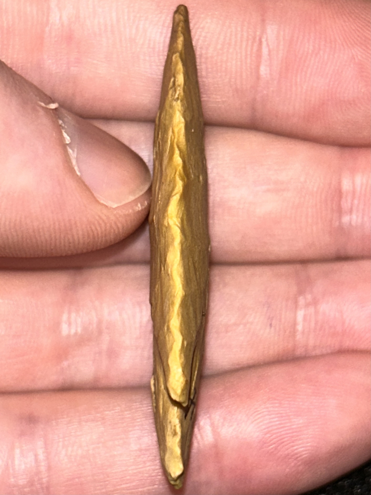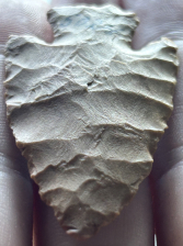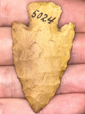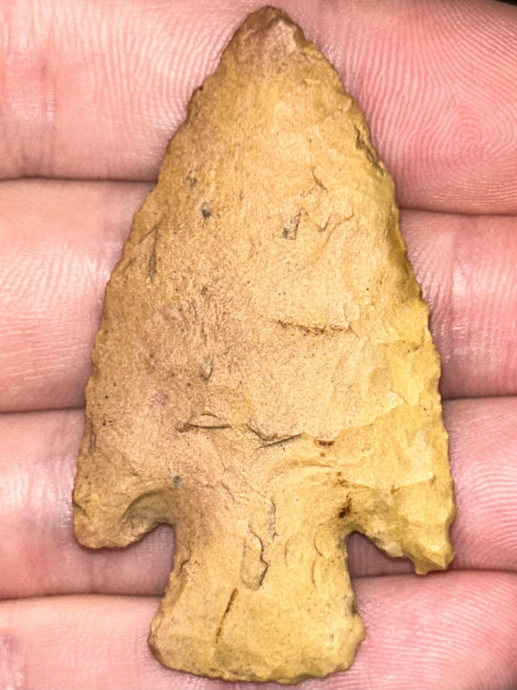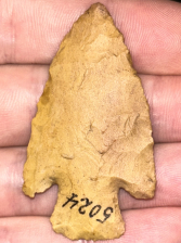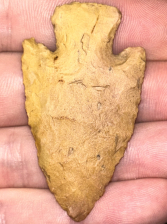 A fantastic Hardin found in Clay County, Arkansas. Made from colorful orange and yellow Crowley’s Ridge chert. Finely made with excellent workmanship.