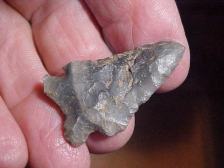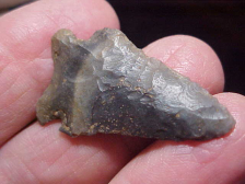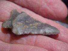 Some collectors will call the point a Pinetree (I would)--some might call the piece a Palmer. As it isn't serrated and the basal edge has only medium-level grinding, I think you could also use a generic "Kirk related dart", your classification be as accurate as a more specific name. The 1&1/2" by 7/8", barely 3/16" thick point is well made of what looks like Sonora Flint, slightly dished-in on one face (see the last photo). The piece was found in Posey County, Indiana, it's been in a family collection long stored away--good color, form, and even better patina. Read that as guaranteed real, period. Shipping is USPS min for a small box, $8.00, checks, cash, or M.O>s are how I welcome payment. Sorry, I do not use paypal--Roy A.