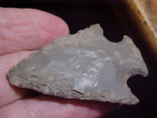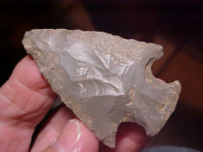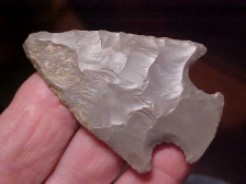 The cost of shipping ($8.00 anymore) comes with the price. The title is about as self-explanatory as I know how to phrase it--heat pop outs scattered around the Harrison County, Indiana, blade of this Hopewell Snyders point. The barbs stayed intact even as the blade was in a cookfire--along the blade edges and the tip you see the pop out effects of heating hornstone--to explain, if you're not familiar with it, Indiana Hornstone will practically explode if it gets too hot (too quickly). This piece, in my personal collection for the last fifteen years, is from a Warrick County, Indiana, collection, measures 2&7/16" by 1&5/8". Neat, authentic artifact. I welcome checks or M.O>s, but do not use electronic payments such as paypal--Roy A.