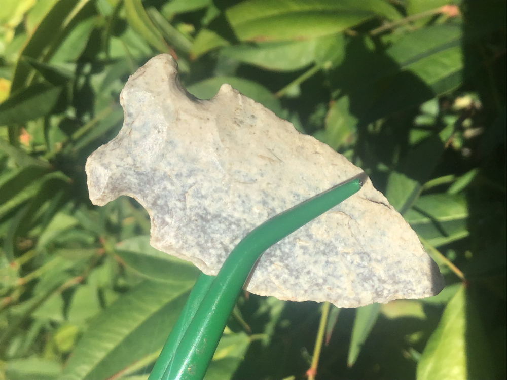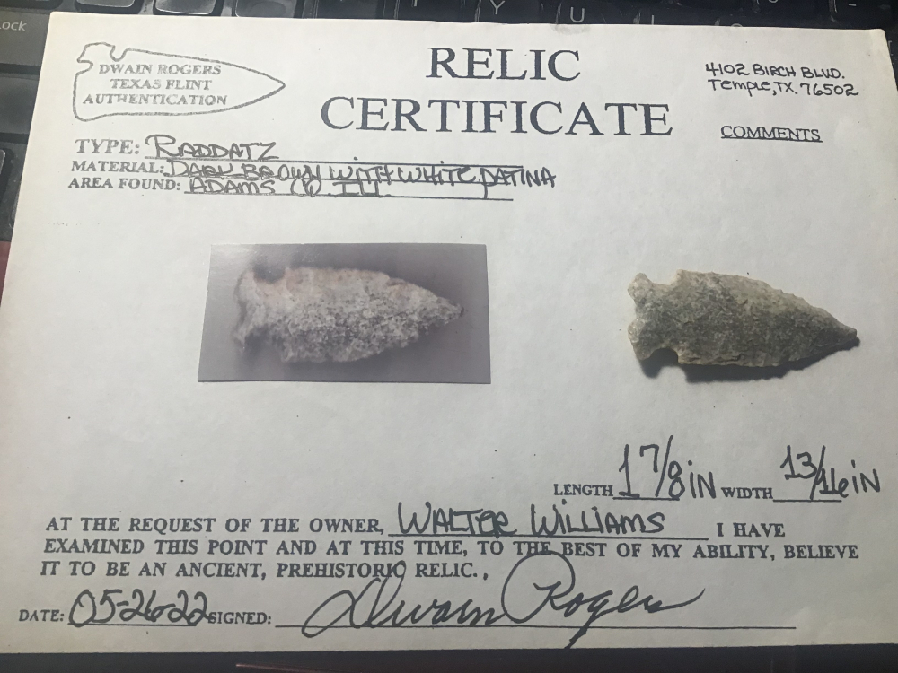 Made of a heavily patinated, semi-translucent chert, this Raddatz was recovered in Adams County, IL. It has a good tip and all edges show use wear. It comes with a Rogers COA and I have the shipping.