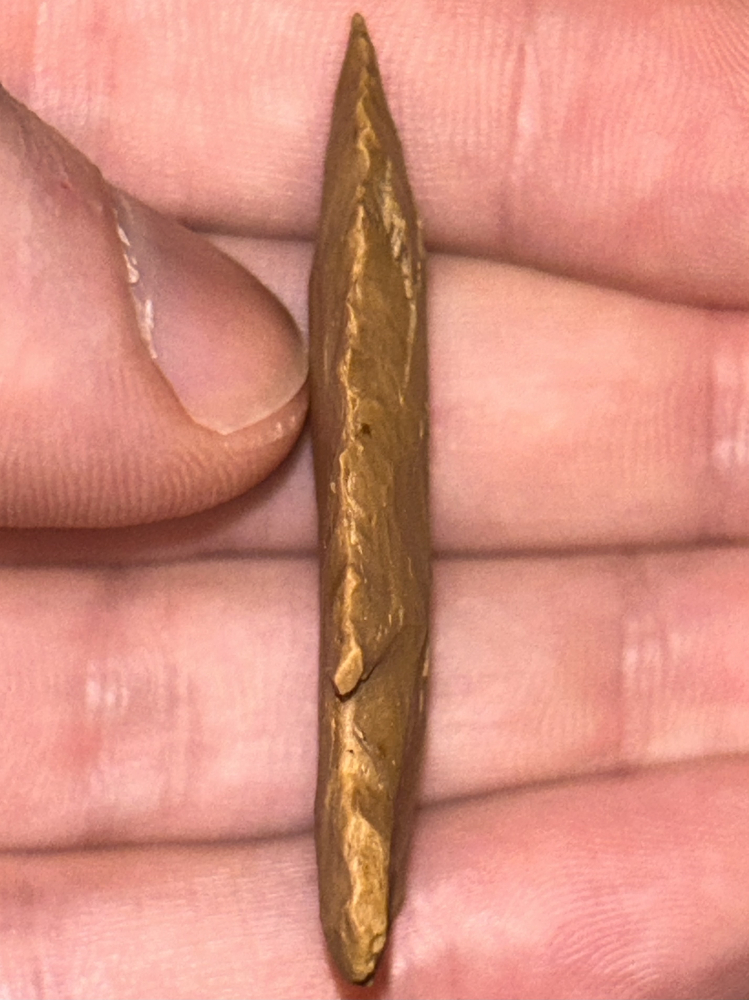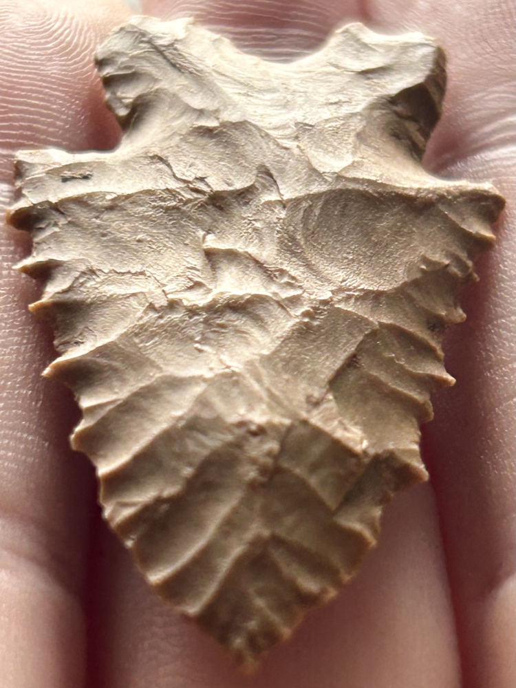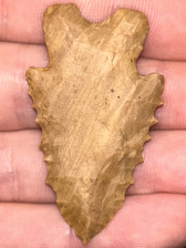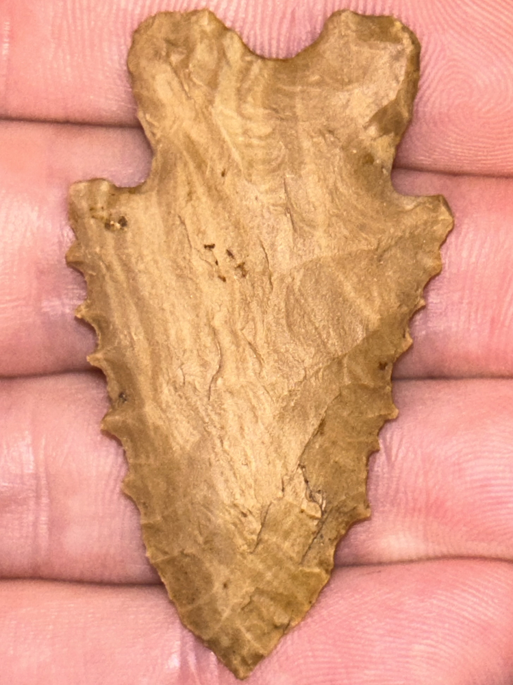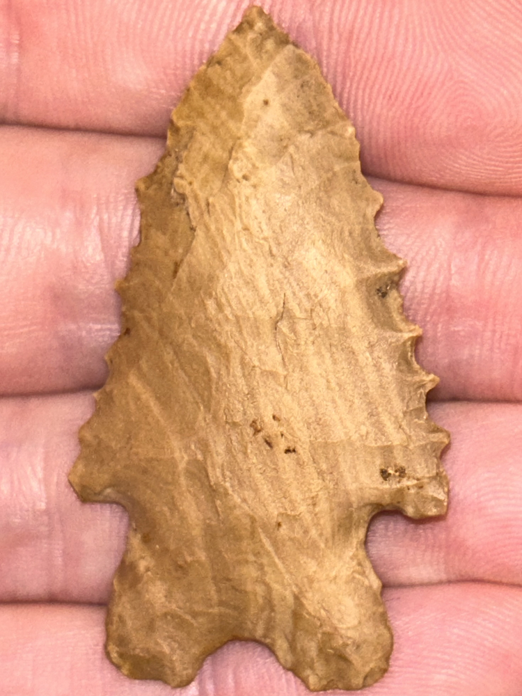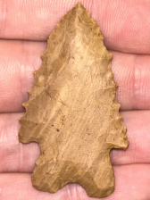 A fabulous MacCorkle found in McCracken County, Kentucky. Made from beautifully striped tan material, likely a local gravel chert. In great condition with fine workmanship and serrated edges. Ex: Chris Barnard.