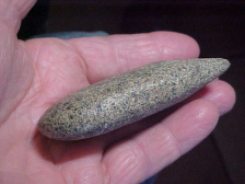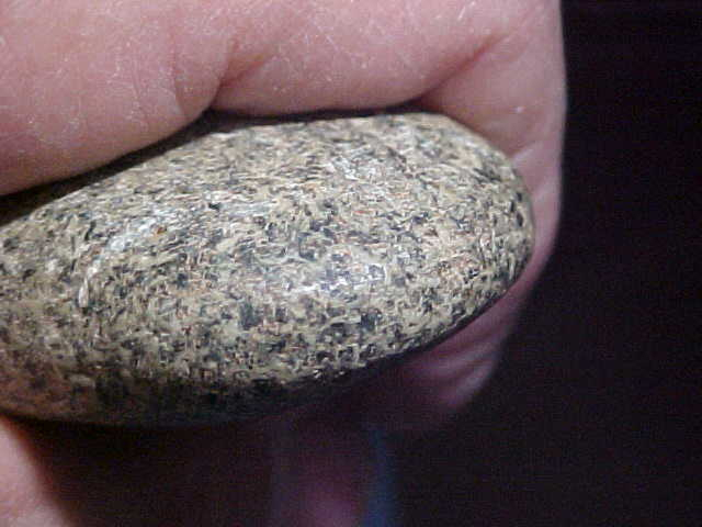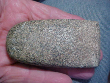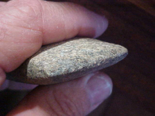 A well made Hopewell Celt, granite, 3&3/8" by 1&3/4", only 13/16" max thickness--the Celt comes from an Evansville, Indiana, area collection--field-found as spotting disc marks isn't too hard. There are only a few light scratches, but they tell you this wasn't a riverbank find. Overall polish is excellent. It's when you start studying the very dulled bit that you start asking "Why'd them dull it like that?" When you get the Celt under magnification you can see the grinding that polished the bit edge--somewhat, at least--old grinding that looks like it was never finished. You can trace one thin plow scratch that goes right across the bit edge--it came later than the Hopewell salvage, and is an excellent way to see "which came later"---and obviously it was the plowing. Note awhat to me is a very interesting feature: the HEEL is more polished than the bit area--for me that's a first--they were using the heel for something, some action that highly polished the granite--but what??? Shipping comes with the price, checks or M.O.s are welcomed. Sorry, I do not use paypal--Roy A.