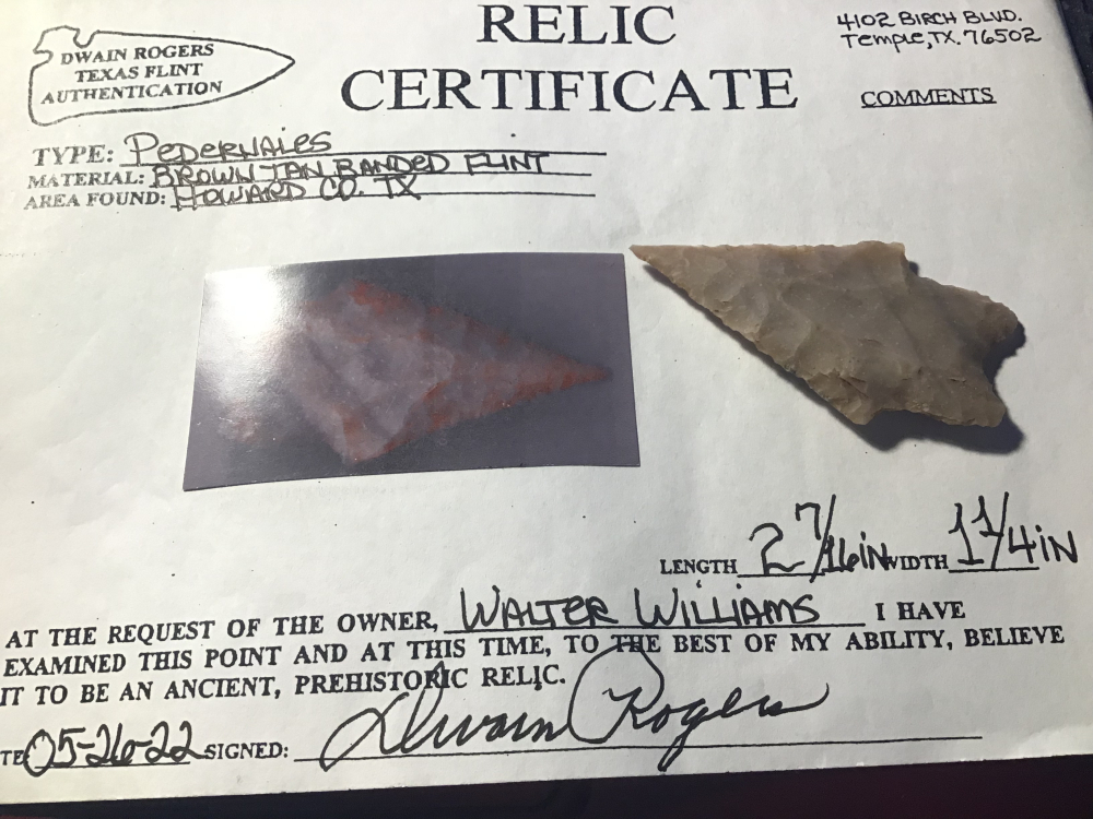This Pedernales has nice thinning flutes on both sides. It is finely flaked It is finely flaked, semi-translucent, with pressure flaked lateral edges. I have the shipping and it comes with a Rogers COA.
