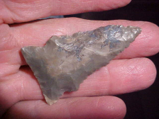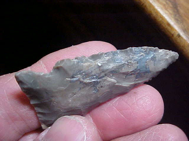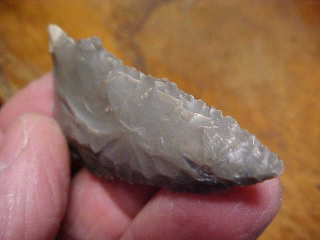 From a frame of Swans Landing--Harrison County, Indiana, finds, made from a very good grade of Indiana hornstone, center-of-nodule flint,2&1/16" by 1&3/16, appropriately thin at just under 5/16" max. The photos should show the micro serration of the blade cutting edges, really tiny pressure chipping. The basal edge is well ground. I wish I could say the barbs were intact, but that constant sharpening of the blade edges, the end points of the barbs were lost (and nicked due to that constant use). Every conceivable detail is guaranteed authentic, EVERY. Shipping is $8.00 (USPS minimum charge for a small box). Checks or money orders are the ways I welcome payment--sorry, paypal is NOT a payment form I use--Roy A.